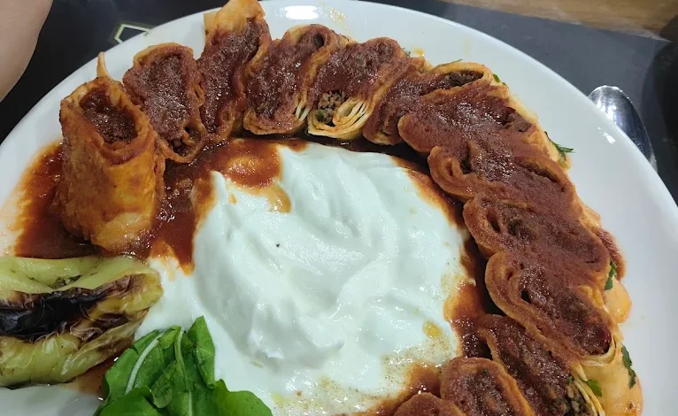LAVAŞ İÇERİSİNDE ET DÖNER, DOMATES SOS ÜZERİNE RENDE KAŞAR YANINDA KÖZLENMİŞ BİBER, BULGUUR PİLAVI, YOĞURT İLE SERVİS EDİLİR