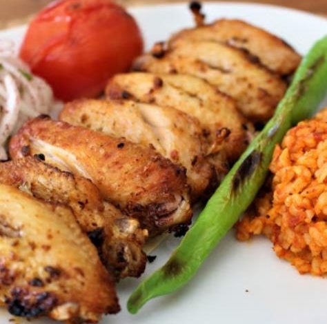Köz domates, köz kapya biber ve soğan ile servis edilir.